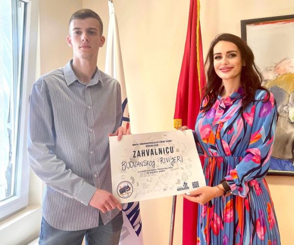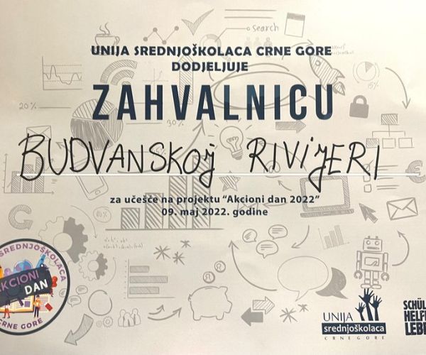 Predstavnici Unije srednjoškolaca Crne Gore uručili su danas zahvalnicu Hotelskoj grupi “Budvanska rivijera” za učešće u projektu "Akcioni dan 2022".